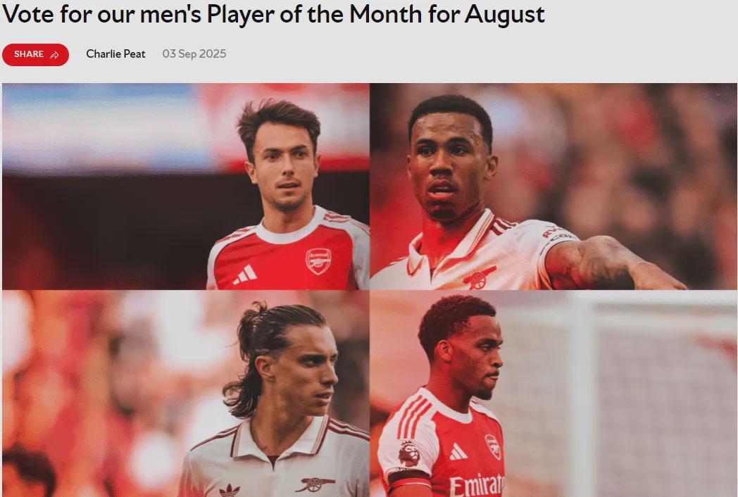 官方:祖比门迪、加布里埃尔、卡拉菲奥里和廷贝尔入选了阿森纳8月份队内最佳球员候选名单。