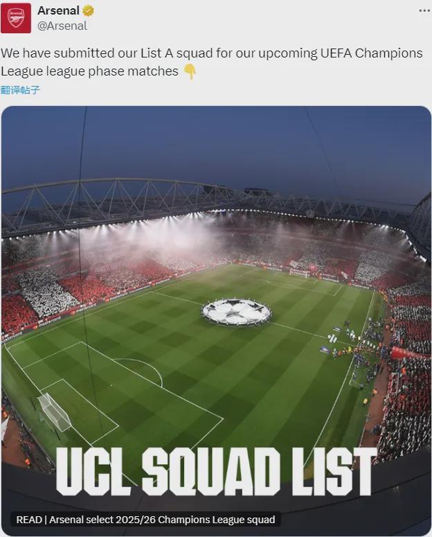 官方:阿森纳向欧足联提交了欧冠联赛阶段A名单。